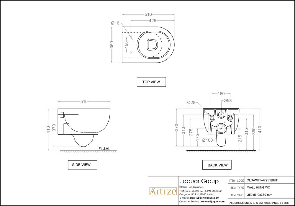 Description: Wall Hung WC With UF Soft Close Seat Cover, Hinges, Accessories Set, Size: 350x510x370 mm